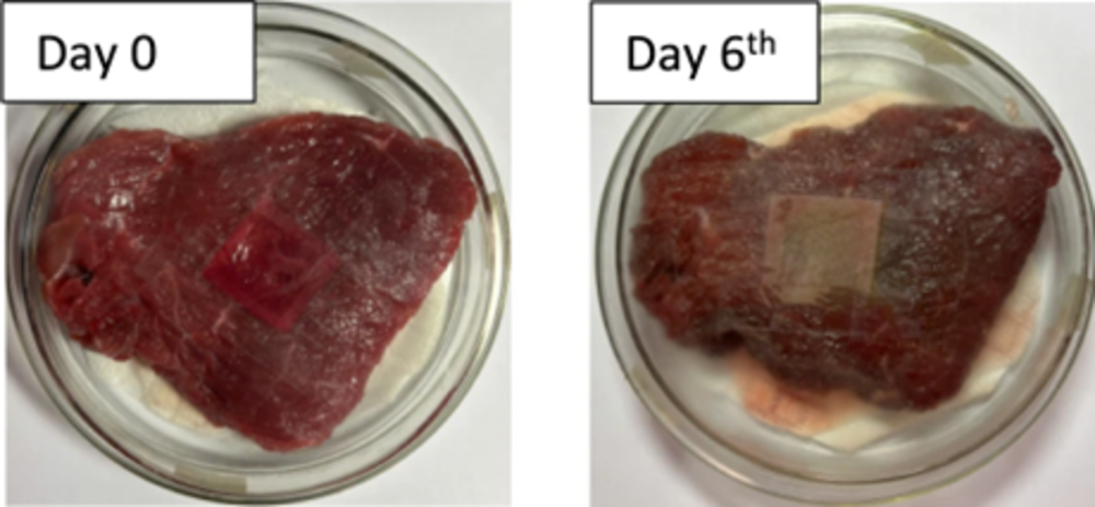 One of the significant findings of the study is the film’s ability to clearly change color over the course of beef storage. As spoilage begins, the increase in total volatile basic nitrogen (TVB-N) levels triggers a color change from reddish-pink to brownish-yellow, which can be easily observed with the naked eye. Specifically, in real-world tests, this color change was clearly recorded after 6 days of cold storage at 2–4°C (Figure 5), allowing consumers and retailers to quickly assess food quality without the need for complex analytical methods.
