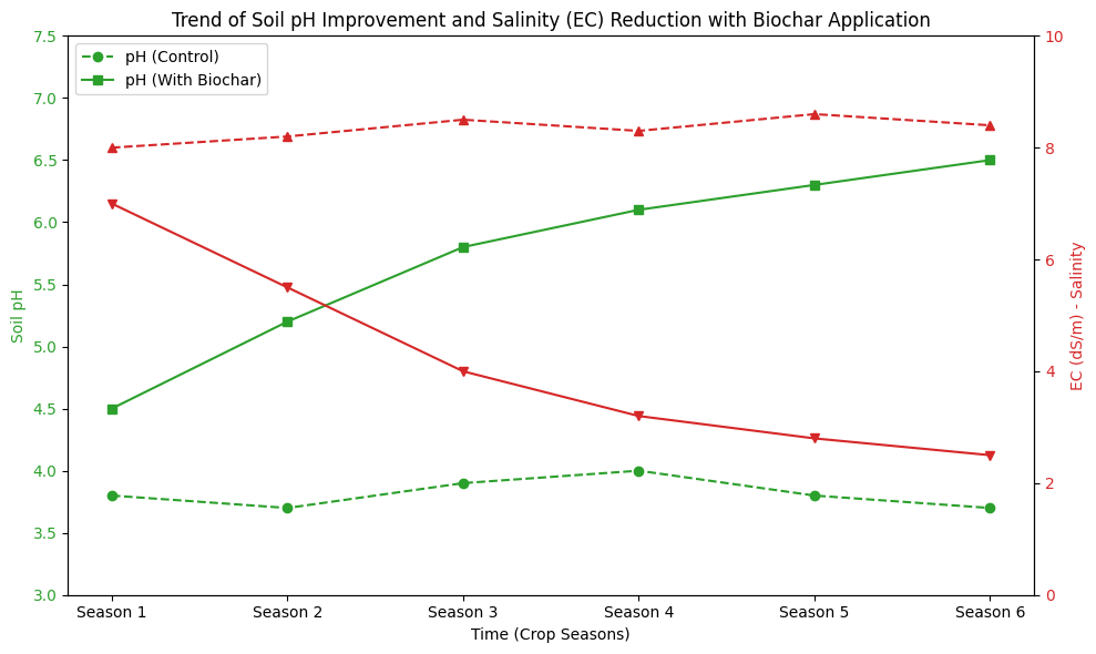 Chart 1 Caption: Trend of soil pH improvement and salinity (EC) reduction over cropping seasons with Biochar application. Illustrated data from a pilot model in Soc Trang province.
