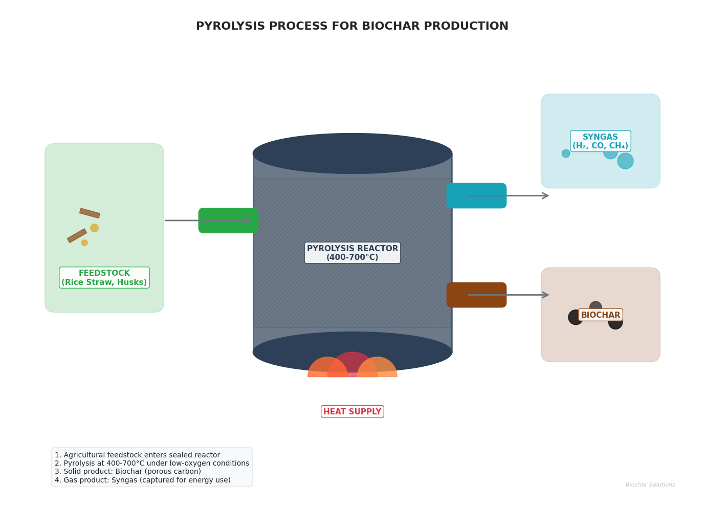 Figure 1 Caption: Pyrolysis process converting rice straw and husks into Biochar. Image creation prompt: A vector graphic illustration of a closed pyrolysis reactor converting organic feedstock into biochar, with syngas being captured, and arrows indicating input and output flows.