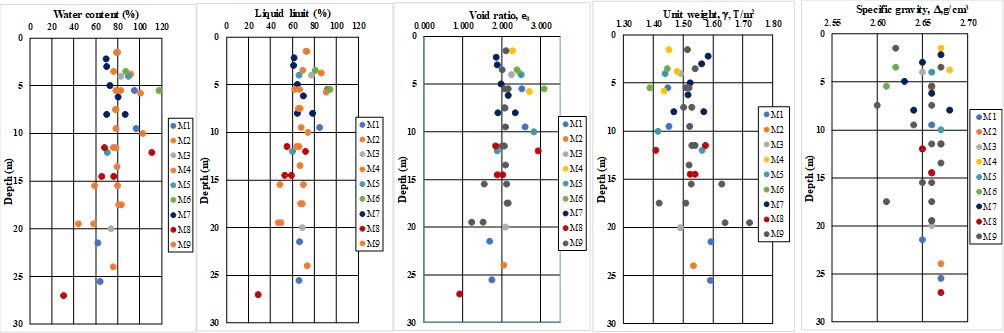 As shown in Figures 3, it can be seen that the natural water content is higher than the liquid limit and soils are in very soft state. Natural water content (W) of soft soil ranges from 30.7% to 117.8% with an average of 78.3%. Liquid limit (LL) varies from 29.0% to 92.1% with an average of 67.7%. Plastic limit (WP) varies from 19% to 57.9%, an average of 38.6%. Void ratio of soil is large, ranging from 0.927 to 3.094, an average of 2.109. The unit weight, specific gravity change from 1.39 g/cm3 to 1.81g/cm3 and 2.60 to 2.68g/cm3 respectively. Based on particle contents and atterberg limits, the soft soils are classified as fat clay (CH) or some Lean clay (CL) in accordance with ASTM 2487. These types of soil are not suitable for construction.