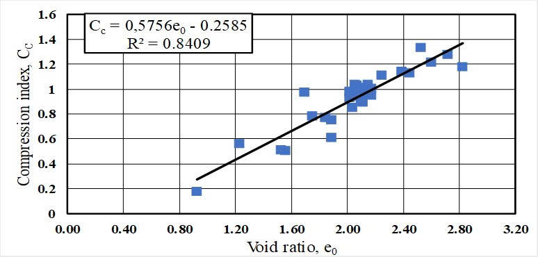 Final, the relationship between compression index and void ratio are showed in Figure 9. As shown in Figure 9, it can be shown that the increase in the void ratio resulted in an increase in compression index. It is consistent of the result of Nu (2014). This is also believed that the increase in void ratio due to the high of organic matter conten, the clay content, the presence of illite, montmorilonit in these soils made a high compressibility of soil. Thus, the compression index increases.