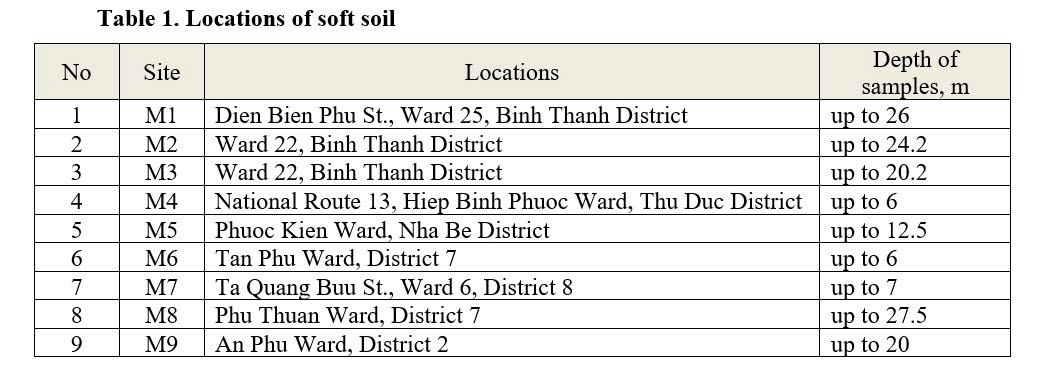 To study on soil consolidation properties, soil samples were collected at boreholes from various locations in Ho Chi Minh city of Vietnam. The sampling depth and the locations are shown in Table 1. The underground water varies from 0.5m to 1.5m and was used to calculate the effective stress and is shown in Figure 4.