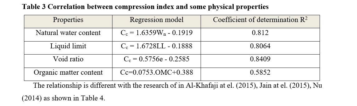 Second, the relationship between compression index and the liquid limit (LL) was established and presented in Figure 8. It can be shown that the increase in the liquid limit resulted in an increase in compression index. It is consistent of the result of Nu (2014) and the reason for this is the high of organic matter content, the clay content, the presence of illite, montmorilonit in these soils. This is also believed that the increase in liquid limit made a high compressibility of soil and resulted in an increase in compression index.