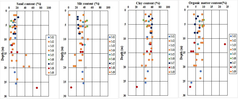 As shown in Figure 2, it can be seen that the clay content is the largest component, varies from 22.4% to 61.2%, silt content changes from 20% to 40%, and sand content is varies from 2.5% to 70.4%. The organic matter content changes from 1.6% to 20.2%.