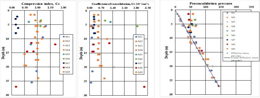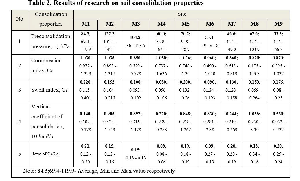 As shown in Table 2, it can be seen that soft soil at various locations had different consolidation properties. Compression index of soft soil varied widely. At sites M1, M2, M4, M5, compression index (Cc) were higher value than that of other sites, varied from 0.972 to 1.329, 0.893 to 1.317; 0.737 to 1.636 and 0.748 to 1.305 respectively. At sites M3, M6, M7, M8, M9 compression index was lower value than that at other sites, and changed from 0.529 to 0.778, 0.490 to 1.040, 0.615 to 0.819, 0.175 to 1.703 and 0.325 to 1.032 respectively. At site M5, compression index had the largest average value and at site M3, the compression index had the smallest value. This can be related to particle composition, water content, and organic matter content. At site M5, clay content and the natural water content, organic matter content were the highest. Otherwise, at site M3, clay content and natural water content, organic matter content were lowest. At sites M1, M2, M5, M6, M7, swell index (Cs) were higher value than that of other sites, varied from 0.115 to 0.401; 0.104 to 0.215; 0.132 to 0.26; 0.134 to 0.193 and 0.120 to 0.158 respectively. At sites M3, M4, M8, M9 swell index was lower value than that at other sites, and varied from 0.093 to 0.102, 0.056 to 0.106, 0.059 to 0.264 and 0.08 to 0.25 respectively. The ratio of Cs/Cc ranged from 0.06 to 0.34.