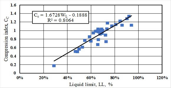 Fig. 8. Correlation between compression index and liquid limit (LL)