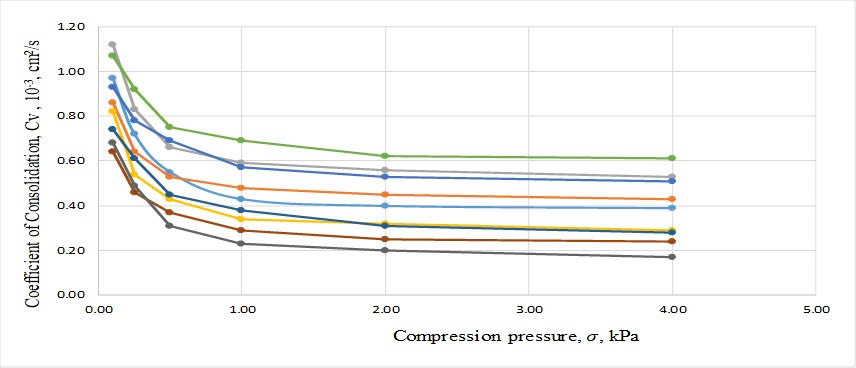 - The coefficient of consolidation decreases with increasing compression pressure.