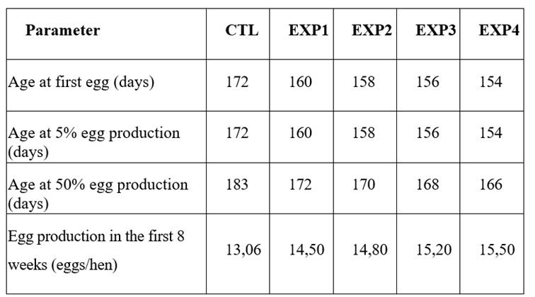 The reproductive performance results are presented in detail in Table 3. Overall, all groups supplemented with earthworm fluid showed advantages in terms of age at sexual maturity and egg production compared to the control group. Among them, the EXP4 group (supplemented with 5 ml/100 g CMF in both phases) exhibited the most outstanding results.