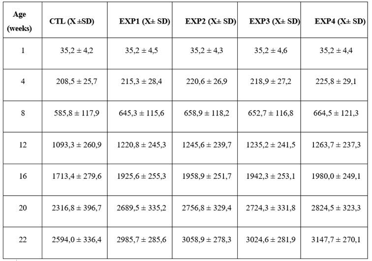 Body weight gradually increased with age in all groups. From week 6 onward, all experimental groups consistently exhibited higher body weights than the control group. By 22 weeks of age, the average body weight of the EXP4 group reached 3,147.7 g, which was significantly higher (p < 0.05) than that of the control group (2,594.0 g).