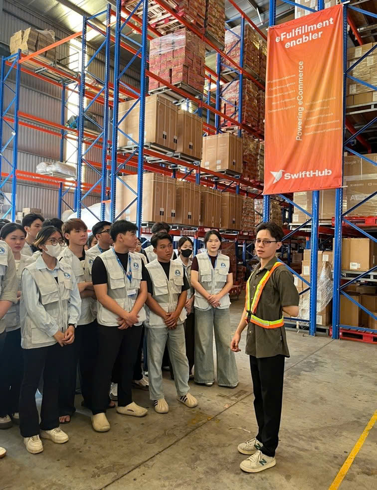 Under the guidance of Meritorious Teacher, Assoc. Prof. Dr. Vũ Ngọc Bích, students were introduced to a comprehensive end-to-end logistics workflow: from inbound receipt of goods, storage within high-rack warehouse systems, and organized picking–packing operations, to order control through information technology and preparation for last-mile delivery. SwiftHub’s team of experts provided in-depth insights into the e-fulfillment model, the role of Warehouse Management Systems (WMS), real-time data, and solutions for optimizing warehouse operational efficiency.