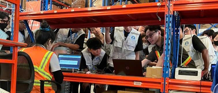 Figure 2. Students observe the high-rack warehouse system and the storage organization practices at SwiftHub.
